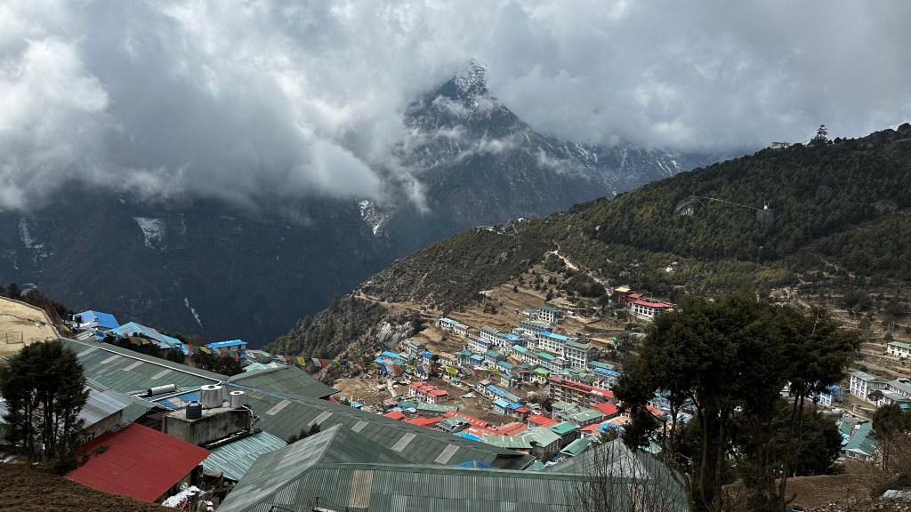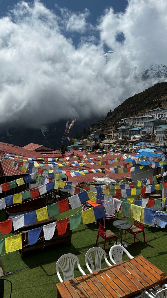 By 9:20 our boots hit the dirt and we were glad that we made the decision to stop here for the night. The next three kilometres were a bit of a grind as we scampered over dirt and debris as yaks and mules made their way down the dirt track. The girls were on top of their game and powered through with no questions asked. I feel like this would have been quite the battle if we had attempted it yesterday afternoon. By 10:30 we had reached the top of the hill at 3600m and had a short rest break at the Ama Dablam guesthouse. The views here were unstoppable and it would have been amazing to wake up to this in the morning, but we continued on through the day as the clouds drifted in and out hiding the peaks temporarily within them. By high noon we covered another five kilometres and were now peering over the edge into the Namche Bazar (3440m) basin and ready for lunch.
