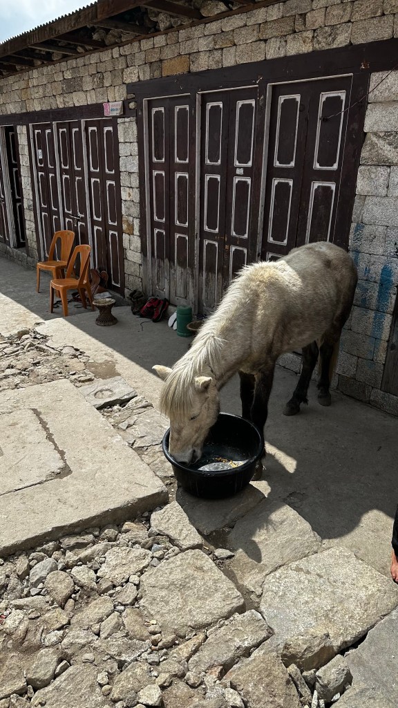 After the hard to break traditional morning regime we packed everything up and payed our bill, 5850NRs. Now sleeping at 3320m the air felt so thick you could almost cut it with a knife. The air temperatures were hovering around zero and climbing quickly as the seconds ticked by. It was warm enough with the sun shining for us to have breakfast outside and watch the yak traffic pass by on the bridge out front.