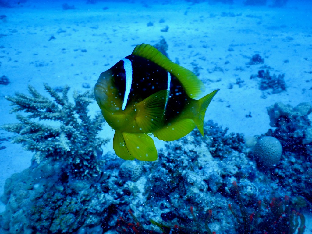 The dive master came over and chatted with us to let us know the plan for the day and what to expect. Within 30 minutes we were getting geared up and leaping off the boat. Five clients, plus dive master, explored the underworld for around 50 minutes seeing a wide variety of sea life. The waters were filled with the traditional parrotfish, banner fish and huge schools of brilliantly coloured orange goldfish-like guys. We even stumbled across a black and white sea snake as well as an octopus. We then got back on the boat where a delicious lunch along with soft drinks and water was waiting for us. We relaxed for over an hour before the boat moved to another part of the reef and attached on to the mooring ball. With gear back on we were down again for another 50-minute dive filled with clown fish in their anemone homes, a second sea snake, lion fish and jellies.