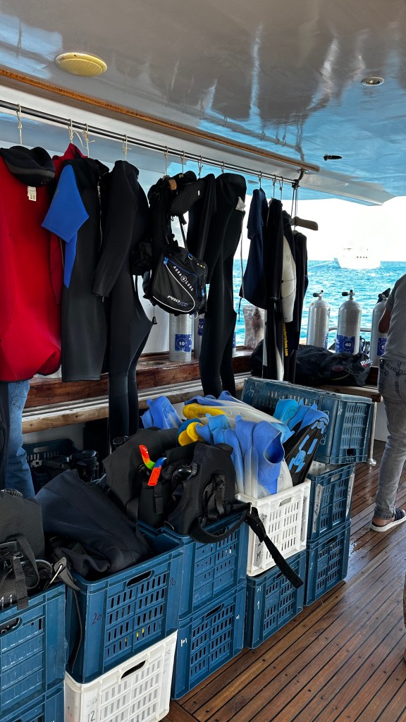 The hotel transfers were even included, so at 8:30 am a man arrived with our information and ushered us into an awaiting taxi. We drove all of two minutes (could have just walked) and arrived at the dive centre at the water’s edge of one of the resorts. We filled out the traditional liability paperwork, paid our remaining tab, got suited up with gear and boarded the boat. For some reason there was a bit of confusion. We got all settled in before someone came over and told us we were on the wrong boat. So we moved our dive gear boxes and switched boats. A short while later someone came around getting us to sign in on the boat we were told once again that we were on the wrong boat. So returning to the first boat for all of us, again moving our gear back. Shortly after we were on our way.