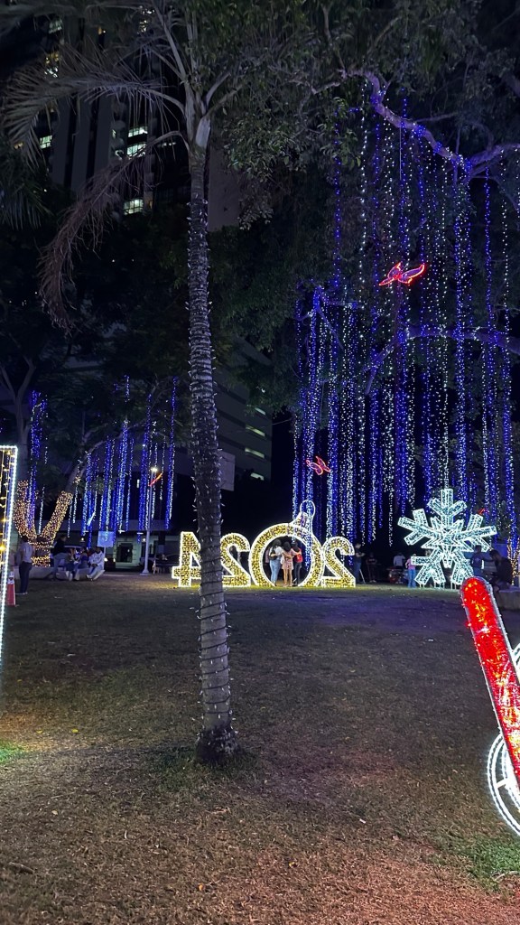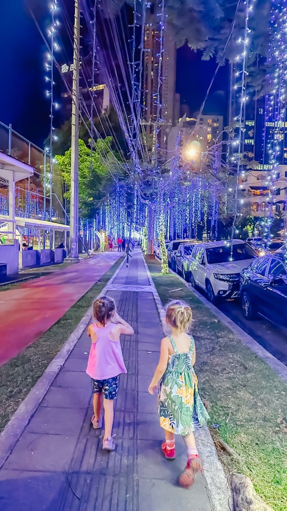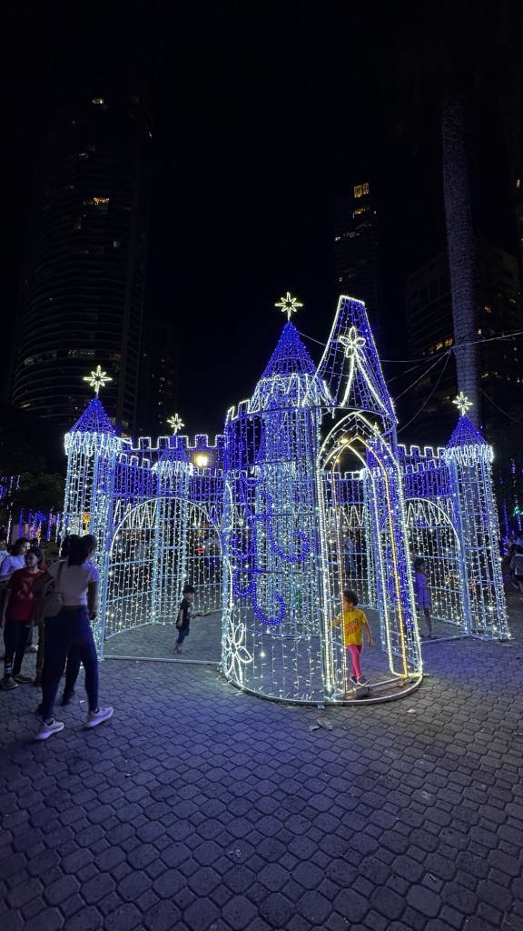 We walked down to the Parque Urraca in the evening and being now into December it was all decorated with Christmas spirit. Even Santa was there along with food and music.