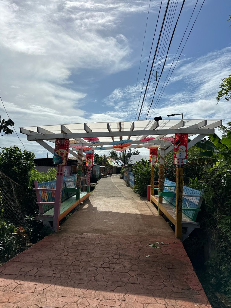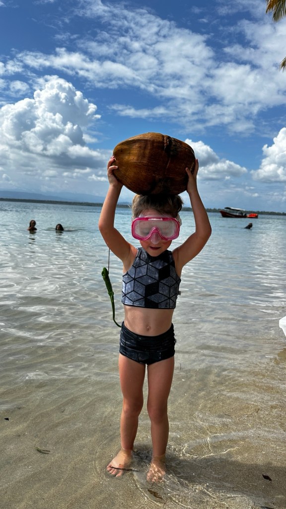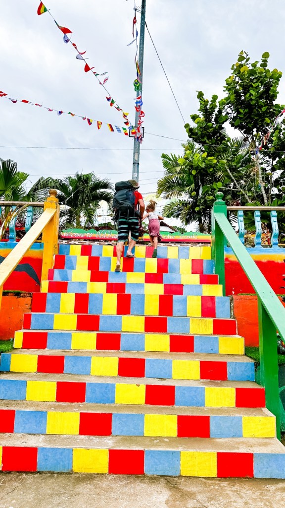 Shannon enjoyed her traditional morning run and learned the highlights and low lights of the surroundings before returning to the waiting family to share on her exploration. With tropical rains over night and high tides the roads made for challenging and almost dangerous situations as the puddles engulfed the roadways and you never know what hazards lie below the surface. Having a kitchen unit in our room we slowly enjoyed our breakfast before packing a lunch with daily supplies and returning to the wharf. $12 / adult for a return ticket we water taxied over to the island of Bastimentos landing in “Old Bank”. A small colourful and seaming festive place was all geared up for Christmas cheer. The vehicle-less island has a quiet feel as the few locals we came across smiled and wave hello as you pass by. We set out with a destination of Wizard Beach on our radar. This consisted of a 1300m walk high up and across to the other side of the island where a strip of yellow sand awaits you.