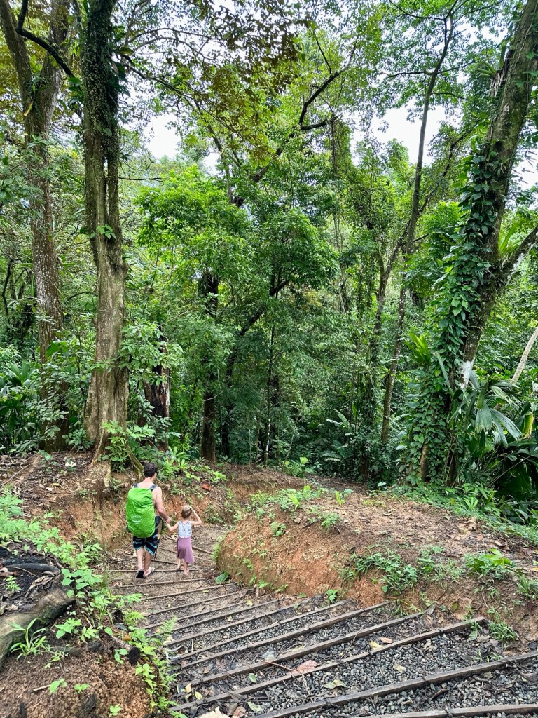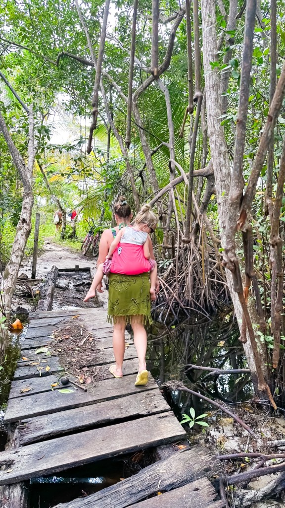 The often muddy jungle walk takes roughly 25 minutes and once we arrived to the other side unexpectedly it was deserted. There is an old rickety structure and one other couple sharing the long outstretched beach with us. We found a perfect place in the sand to lay down our sarongs while the girls searched for unique rocks, shells and coconuts. Wizard beach is best known as an intermediate surf locations with a reef break so the waves were a touch large for the girls to play in. We all just stood back, relaxed and watched them crash into the shore. After lunch, snacks and imagination games with the girls we noticed that we were quickly loosing shade. The sun was much too strong for our tender skin and we soon found ourself in the outer edge of the jungle.