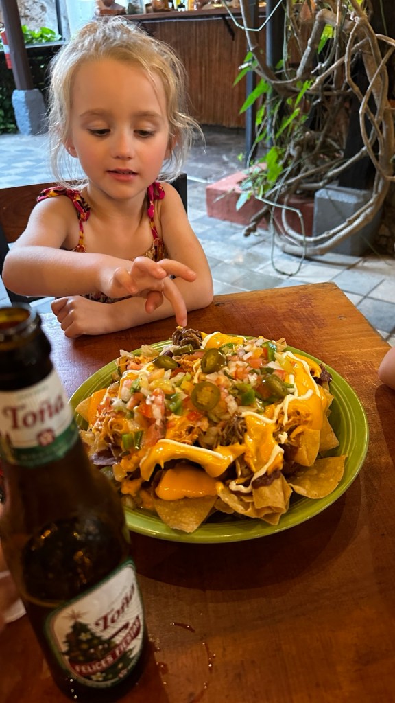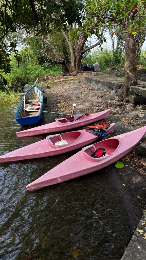 After offloading our bags we proceeded to the water and plopped ourself down on a pair of kayaks. With in a few paddle strokes we were now making our way along the shore line in search of monkeys that we overheard of from the table next to us. 25 minutes later we returned without any sightings but the views of the lake and shoreline were more than satisfying. It was now time for a swim in the magical waters. Being the inside of a volcano, as one can imagine, the shore drops off rather quickly. The girls took over the floating dock and proceeded a seemingly endless pattern of jumping off and splashing about. They would only leap off the one side of the dock into the two meters of water as the other edges disappeared into the black abyss with just a few steps. The in-house restaurant served food and drinks with prices comparable to the big city.