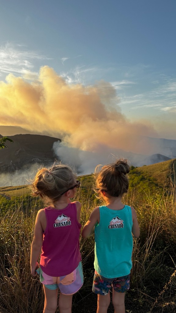 The first order of business, well second after laundry, was to arrange for a trip to the ever active Masaya Volcano. The hotel host arranged for a shuttle to pick us up and fill our afternoon with activities. For $25 US per adult, kids under six are free, we were taken through the gates by 4:00 pm and parked alongside a massive hole in the ground releasing copious amounts of gasses into the air. You can walk right up to the edge of the crater and peer down inside with nothing but a one meter high stone wall between you and molten rock. Still being daylight we took a short 25-minute walk to the top of the original and much larger crater edge. From here we had the opportunity to enjoy the sunset beyond the smoking volcano.