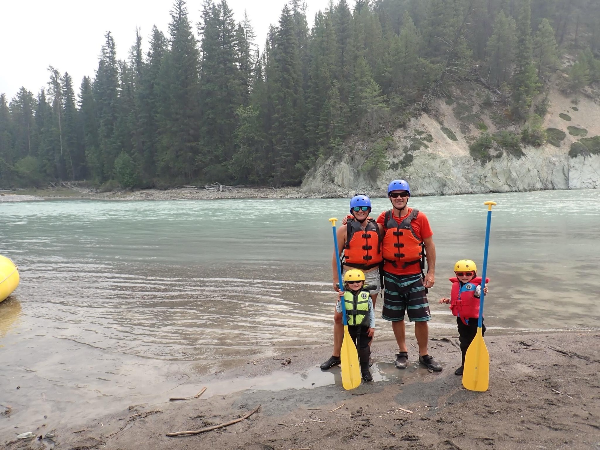 We were all suited up in our gear and they actually had wetsuits that fit our little twins like a glove, complete with booties, life jacket and helmets. Before long we were on the bus and heading out. We climbed out of town through the famous narrow canyon near the Radium Hotsprings and you could hear the crashing river echoing off the walls as we climbed. Luckily for us this portion of the river was not on the itinerary.