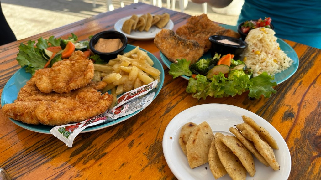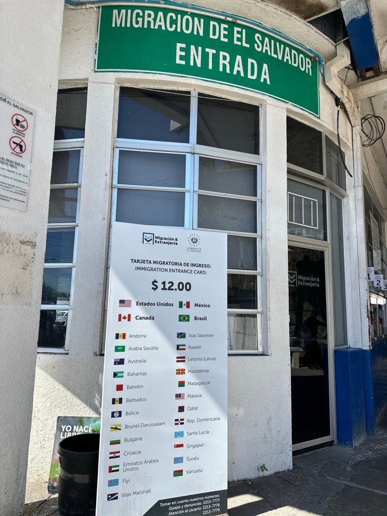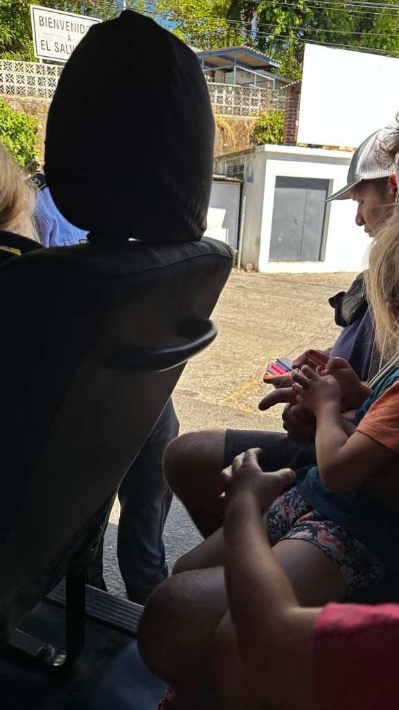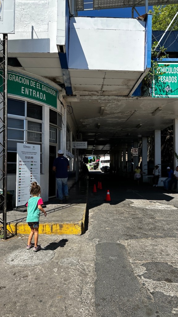 Into the shuttle and passing through no-mans-land and arriving on the El Salvador side. Here we parked and the driver took our passports into immigration. We got out and stretched our legs and used the cleanest bathrooms we’ve seen so far at any border crossing. Once immigration was done with our passports they came out to the shuttle to verify who we were and made us Canadians pay a $12 tourist entry fee for us adults, the kids were free. Welcome to El Salvador!